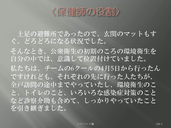 Edit Item 保健師による東日本大震災復興支援プロジェクト エピソード集|<保健師の役割 208-1>