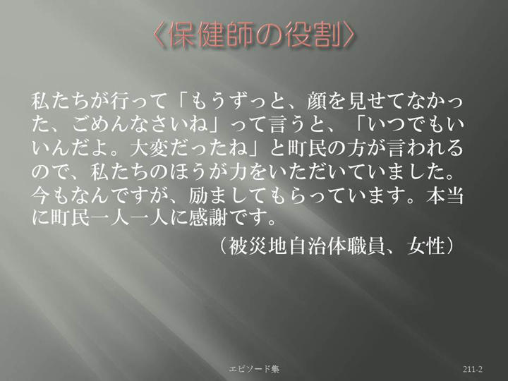 Edit Item 保健師による東日本大震災復興支援プロジェクト エピソード集|<保健師の役割 211-2>