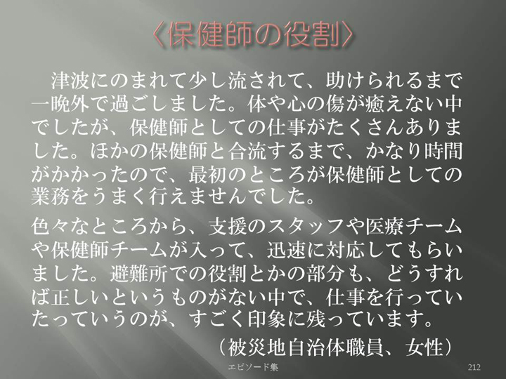Edit Item 保健師による東日本大震災復興支援プロジェクト エピソード集|<保健師の役割 212>