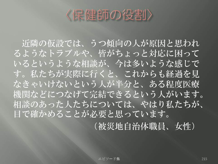 Edit Item 保健師による東日本大震災復興支援プロジェクト エピソード集|<保健師の役割 215>