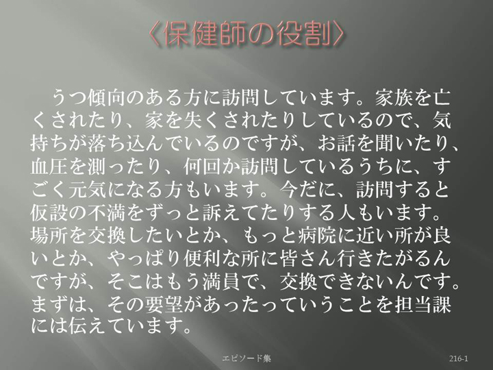Edit Item 保健師による東日本大震災復興支援プロジェクト エピソード集|<保健師の役割 216-1>