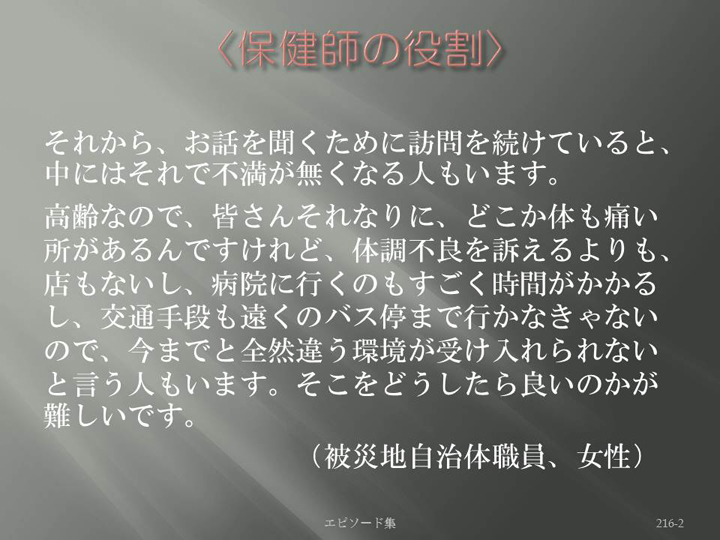 Edit Item 保健師による東日本大震災復興支援プロジェクト エピソード集|<保健師の役割 216-2>