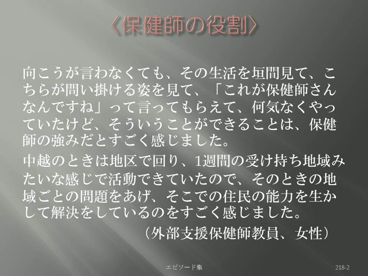 Edit Item 保健師による東日本大震災復興支援プロジェクト エピソード集|<保健師の役割 218-2>