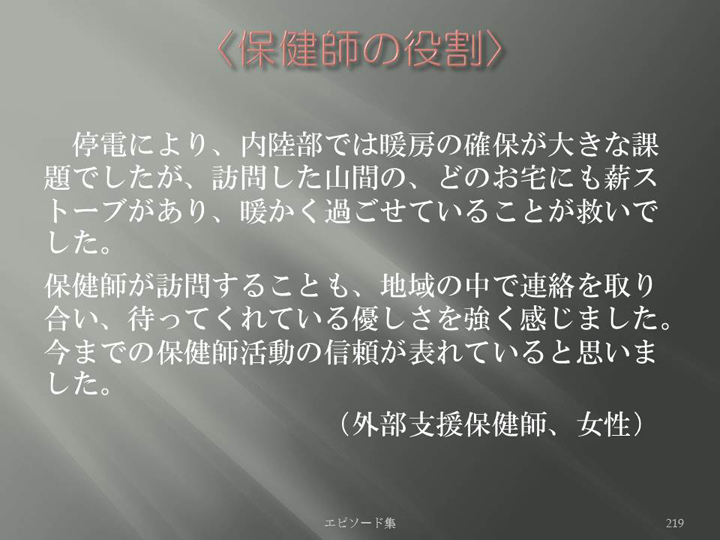 Edit Item 保健師による東日本大震災復興支援プロジェクト エピソード集|<保健師の役割 219>