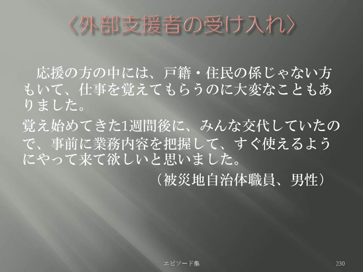 Edit Item 保健師による東日本大震災復興支援プロジェクト エピソード集|<外部支援者の受け入れ 230>