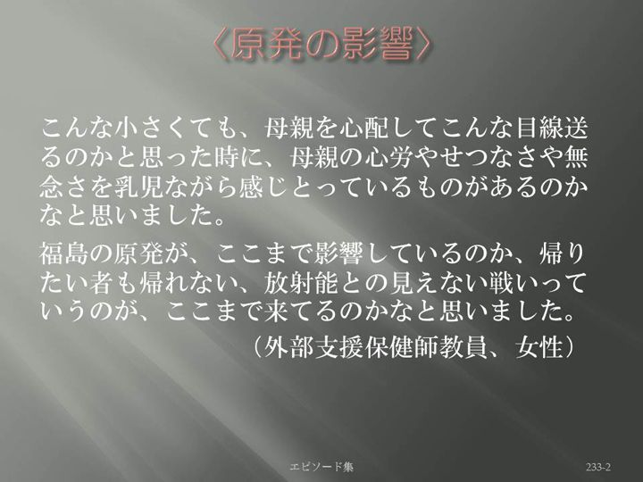 Edit Item 保健師による東日本大震災復興支援プロジェクト エピソード集|<原発の影響 233-2>